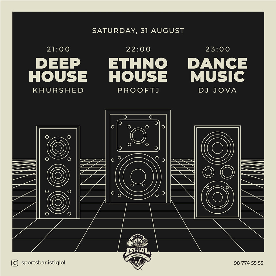 Можно будет танцевать под сеты диджеев Khurshed, который играет в стиле Deep house, PROOFTJ в стиле ethno-house и DJ Jova в стиле dance music. Начало в 21:00.