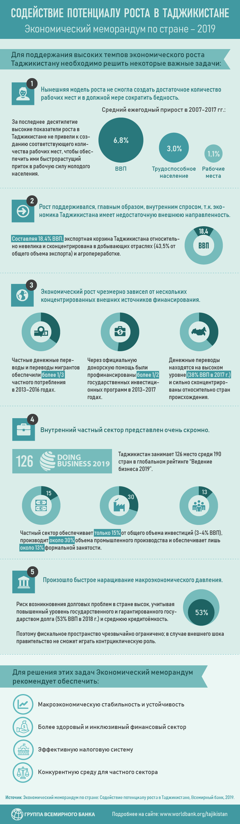 «Такие результаты объясняются слаборазвитой и сложной деловой средой. Таджикистан занял 123 место из 190 стран в рейтинге Doing Business в 2018 году и 79 из 137 стран в рейтинге глобальной конкурентоспособности Всемирного экономического форума 2017–2018», — говорится в докладе.