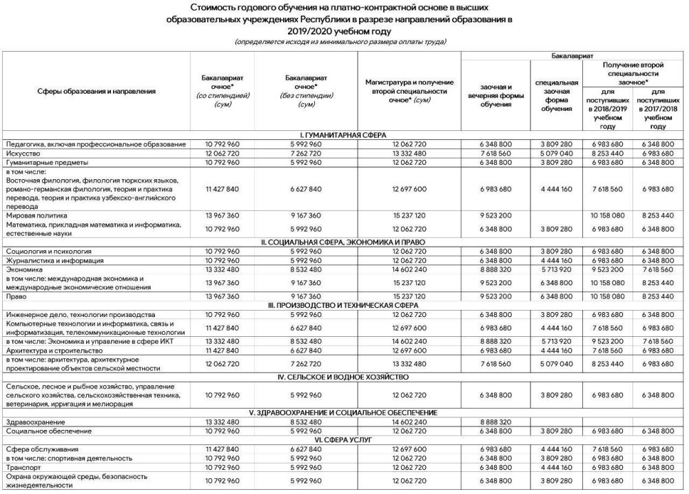 Согласно таблице Министерства высшего и среднего специального образования Узбекистана, стоимость обучения в узбекских ВУЗах определяется по сферам образования и направлениям.
