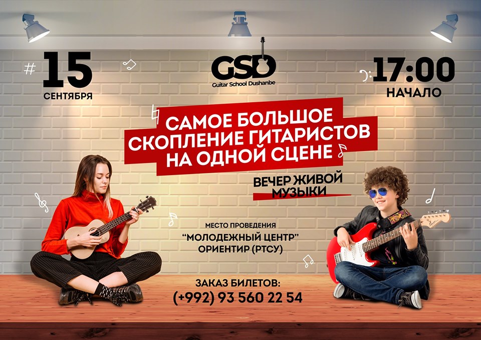 А этот анонс для любителей живой музыки! 15 сентября в 17:00 Guitar School Dushanbe вместе со своими учениками исполнят для вас лучшие песни, композиции прошлого и нынешнего тысячелетия. Живой концерт состоится в «Молодежном центре» (ориентир РТСУ). Заказать билеты можно по телефону: +992 93 560 22 54