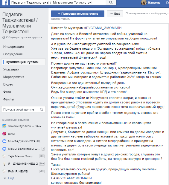 Рустам Шокиров в Facebook в группе «Педагоги Таджикистана» опубликовал пост: «В Душанбе эксплуатируют учителей по воскресеньям!”
