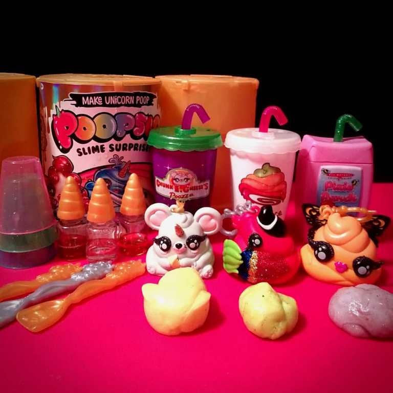 Так вот, чтобы единорог Poopsie сделал слайм, его нужно накормить смесью из специального порошка и воды. Затем — потрясти, чтобы ингредиенты перемешались, посадить на горшок и ждать «сюрприз». Через минуту нужно нажать игрушке на специальную кнопку на животе, и слайм останется на дне горшка. Как и положено, он выходит из задней части единорога, из отверстия в форме сердечка. Но это ещё не всё: свежесделанный слайм можно украсить — добавить блёстки и мерцающий порошок и хорошо перемешать всё руками. В продаже есть четыре единорога: Rainbow Brightstar, Oopsie Starlight, Whoopsie Doodle и Dazzle Darling. Они отличаются цветом волос и дизайном аксессуаров.