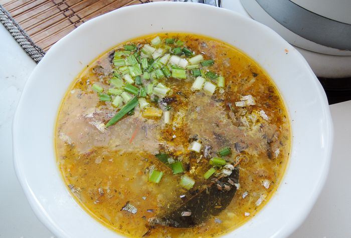 Когда обычные супы уже приелись, можно приготовить совсем простенький суп из рыбных консервов с яйцом и овощами. Повару для приготовление супа нужны: картофель, морковь, яйцо, репчатый лук, консервированная рыба, растительное масло, лавровый лист, вода и соль.