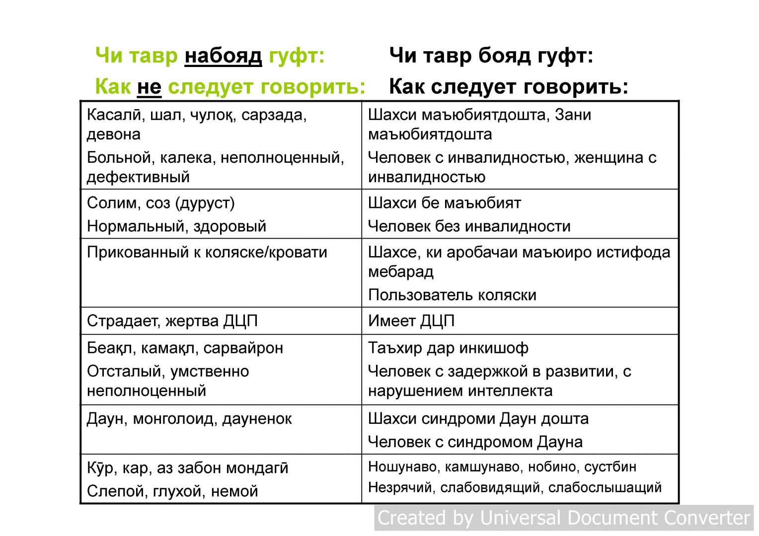 Термин «person with disability» — «человек с инвалидностью» — применяется и в Конвенции ООН. Мировым стандартом считается правило «рeople-first language» — когда говорят о ком-то, первым делом называют его человеком, а уже затем говорят о его болезни или особенности. Выражения «человек с ограниченными возможностями» рекомендуется избегать, так как оно, наравне со словами «больной», «неполноценный», создаёт стереотипы. В английском языке слово invalid — «немощный» — давно не употребляется для обозначения человека с особыми потребностями. К сожалению, вся эта некорректная терминология присутствует в таджикских СМИ, и не только эта.