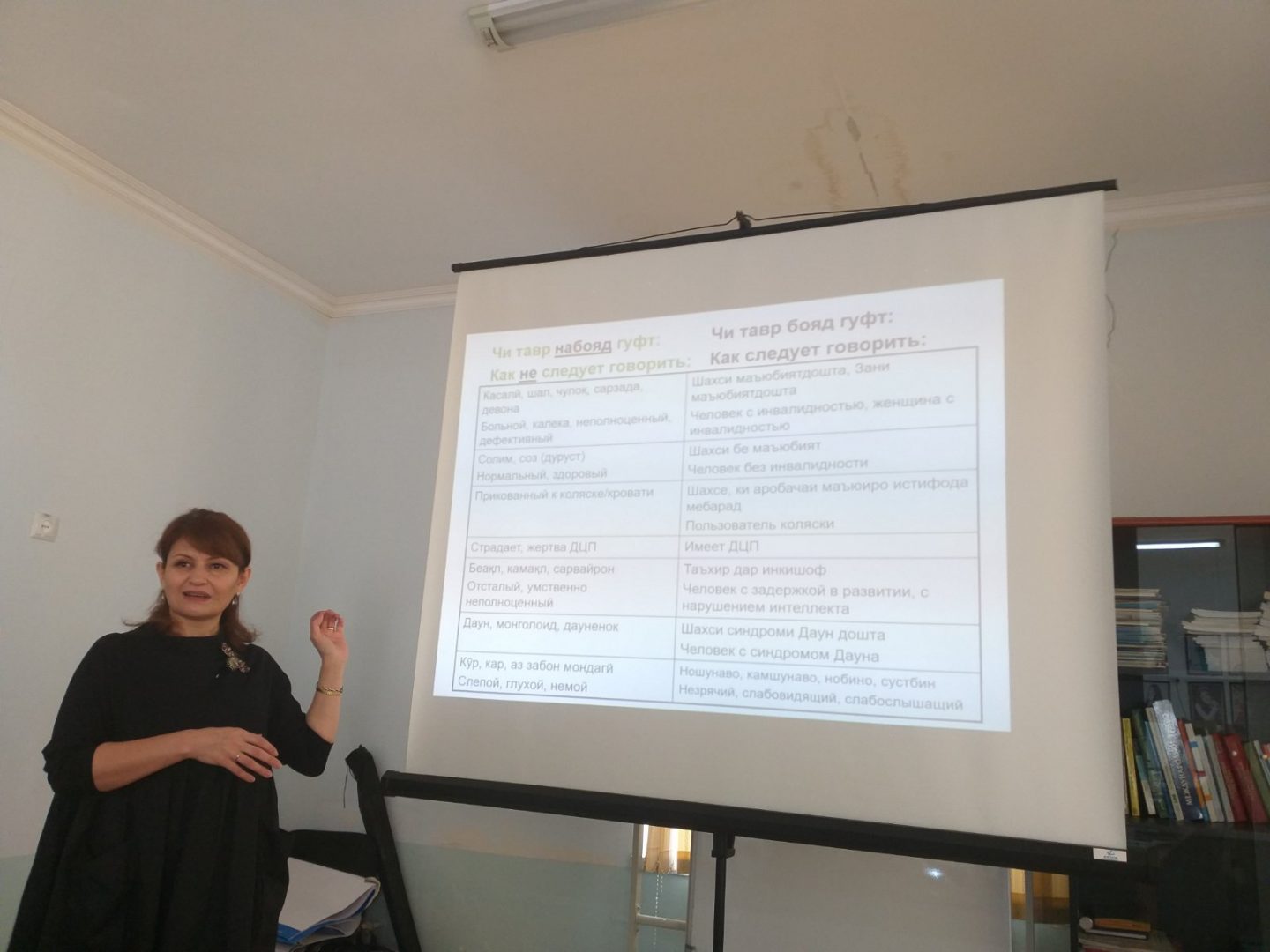 "Мы выступаем за то, чтобы все говорили «люди с инвалидностью», этот термин нас устраивает. В Таджикистане пока нет рекомендаций, какие термины употреблять; до сих пор во всех официальных документах используется на русском языке слово «инвалид», на таджикском «маъюб», и такие же термины используют наши журналисты. Но нам они не нравятся", — объясняет Саида.