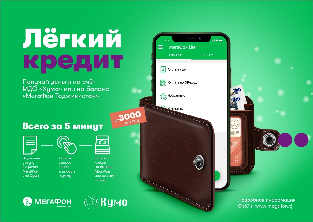 У абонентов компании «МегаФон Таджикистан» появился быстрый и легкий способ получать кредиты на баланс своего телефона или на счет в ЗАО МДО «Хумо». Средства, полученные с помощью услуги «Легкий кредит Хумо», доступны для перевода на карты системы «Корти милли», оплаты покупок через «Кошелек» мобильного приложения «МегаФон Life» или обналичивания в центрах банковского обслуживания и филиалах «Хумо».
