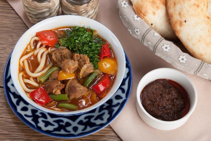 В меню в эти дни гостей ждут такие гастрономические изыски, как таджикский суп-машхурда с азиатской фасолью маш и рисом, узбекский лагман из баранины, туркменский фитчи-пирог с мясом, казахский чак-чак в медовом сиропе и киргизский куурма-чай с молоком.