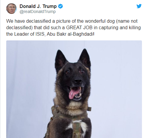 Дональд Трамп объявил об участии нескольких служебных собак в операции по захвату аль-Багдади на пресс-конференции 27 октября. По его словам, животные преследовали лидера ИГ в тоннеле, где он взорвал пояс смертника. Во время операции одна из собак была ранена. Американские СМИ предполагают, что именно ее фото выложил Трамп.
