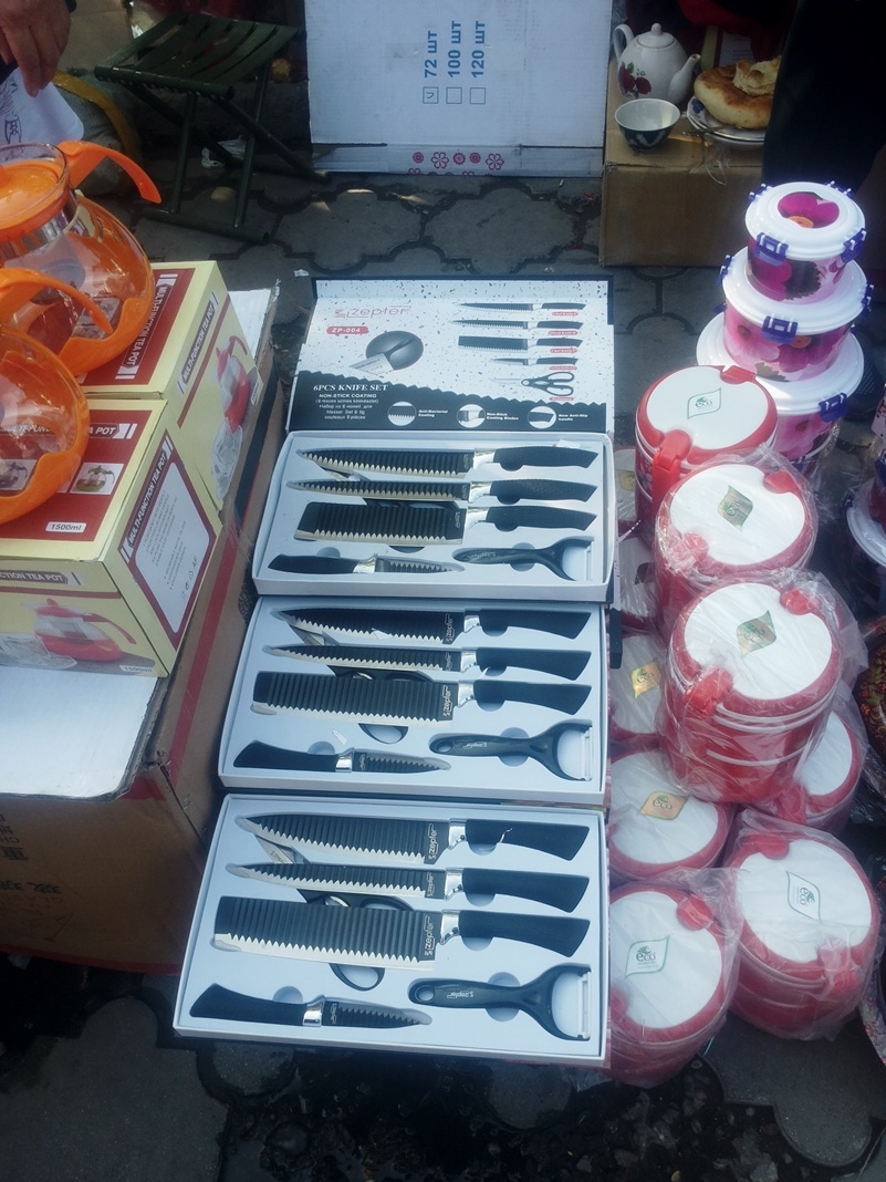 Первым делом мы поехали на столичный рынок «Корвон», где, как известно, продают все, что необходимо в быту, в том числе и ножи. Однако, пройдя по торговым рядам, мы так и не обнаружили что-то подобное тому, что показывали на сводках МВД. Везде – обычные кухонные ножи.