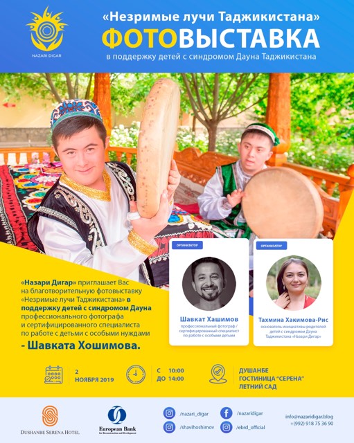 — В 10:00 в саду гостиницы «Серена Душанбе» пройдет благотворительная фотовыставка профессионального фотографа Шавката Хошимова «Незримые лучи Таджикистана» в поддержку детей с синдромом Дауна. Собранные средства будут удвоены Банком реконструкции и развития в рамках программы «Общественная Инициатива».