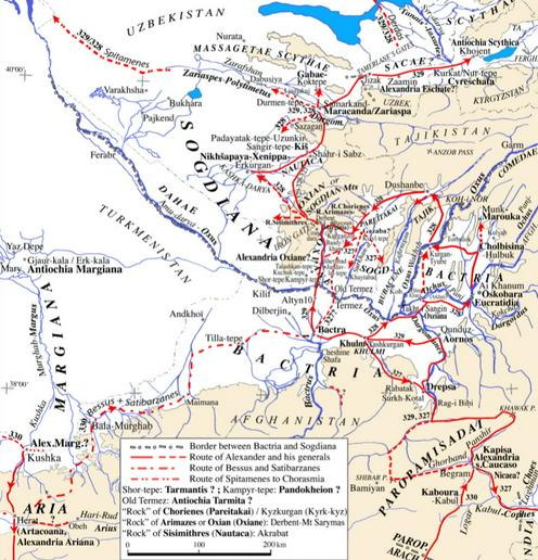 — Ясно, что истории Александра не отличаются точностью с точки зрения географии, и их анализ требует специальной методики. Так, в частности, они дают не больше информации, чем ахеменидские источники, по поводу границ областей Средней Азии, особенно Бактрии и Согдианы. Начиная с XIX века большинство ученых считают, что граница между Бактрией и Согдианой проходит по Гиссарскому хребту, у Железных ворот; исходя из этого, они определяют регион к северу от Амударьи (Окса) сконструированным наименованием «Северная Бактрия». Сегодня это положение стало аксиомой для многих археологов.