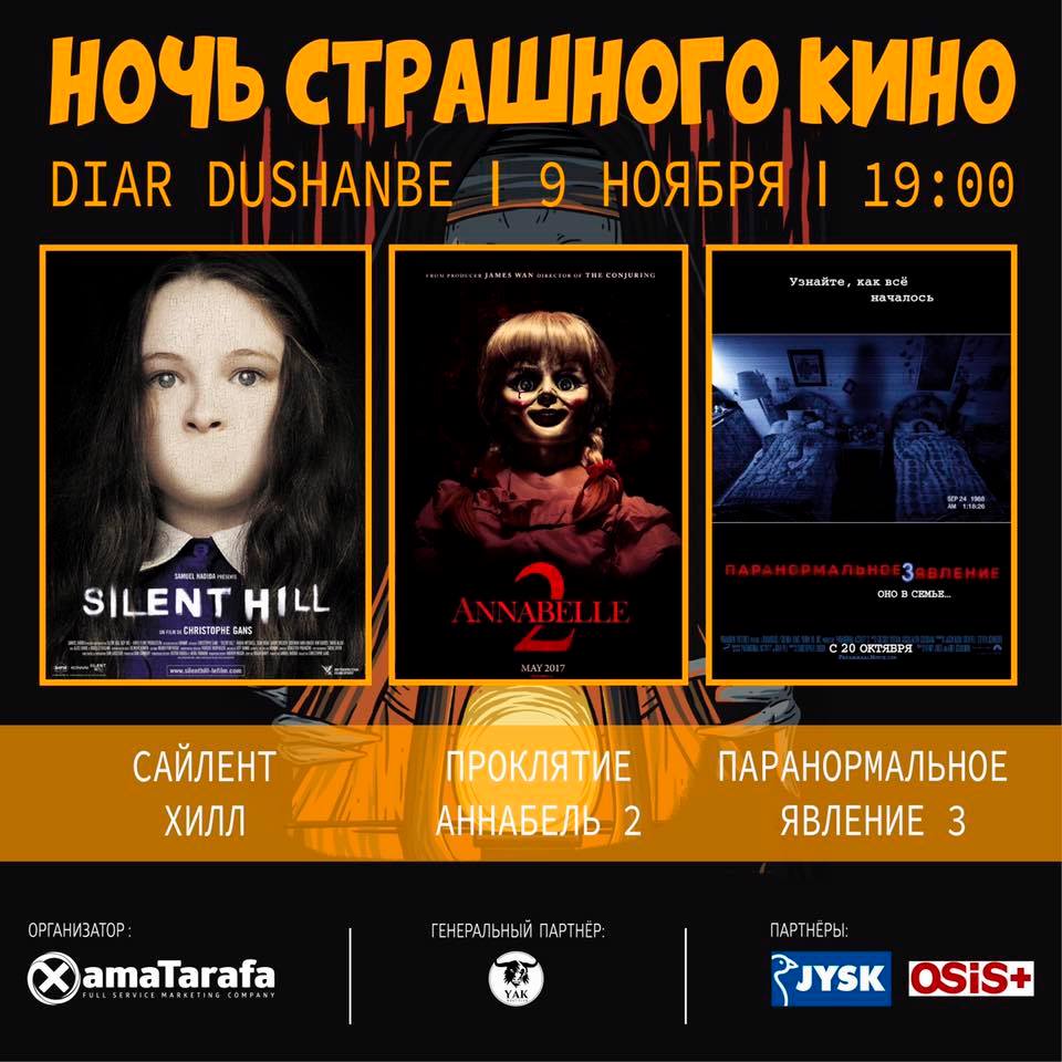 — В 19:00, в холле Diar Dushanbe, состоится "Ночь Страшного Кино", данное мероприятие состоит из просмотра трех хоррор-фильмов. Стоимость — 100 сомони.