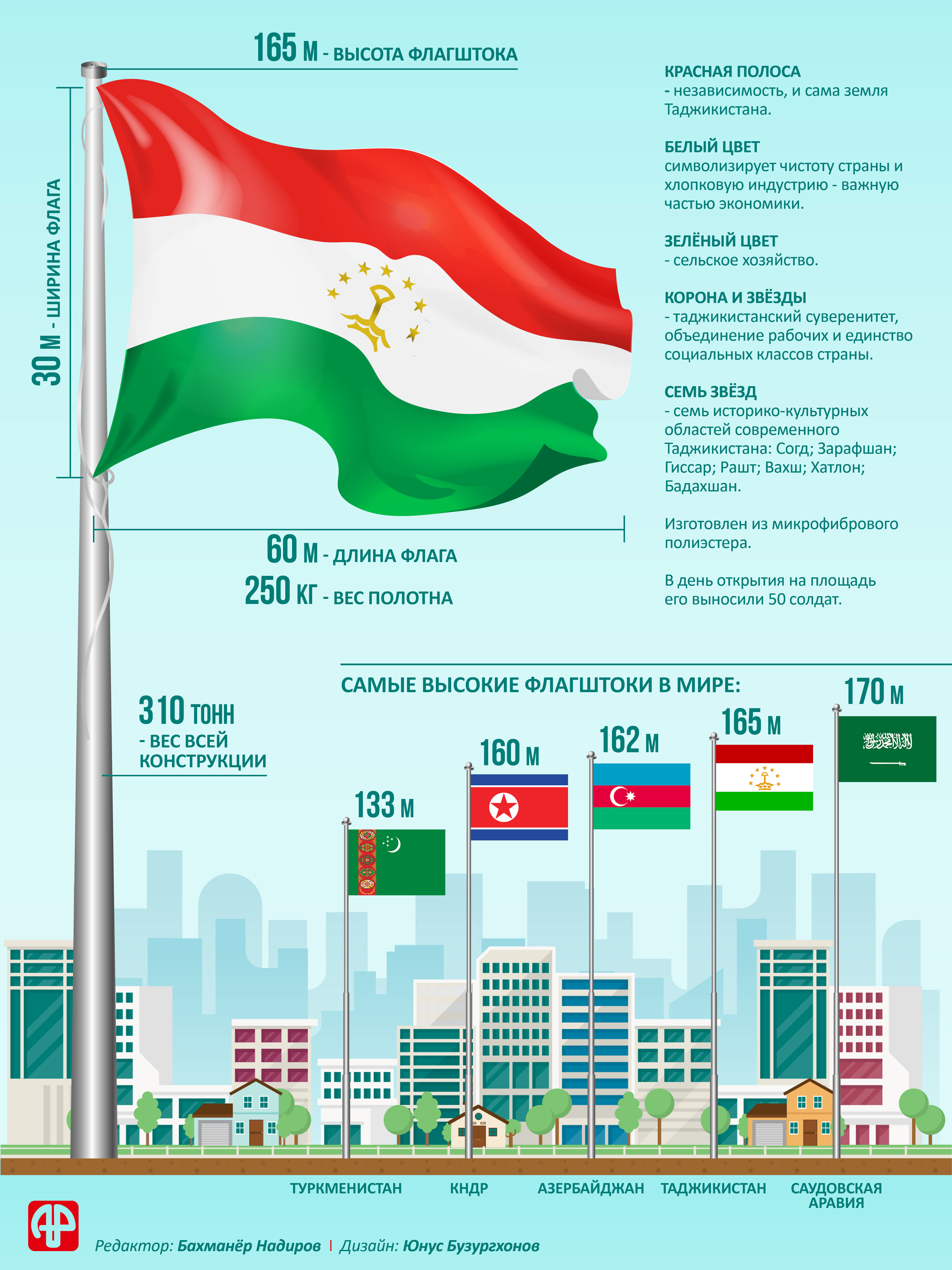 Выяснилось, что самый большой флаг (30 м в ширину и 60 м в длину) на нашем флагштоке произвели за пределами страны. Однако нам не удалось уточнить, где именно он был сшит.