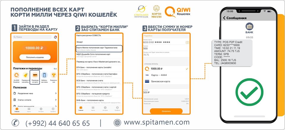 Переводите денежные средства своим близким на карты национальной платежной системы Корти Милли любого банка и карты международных систем UnionPay и VISA, выпущенные Спитамен Банком, без комиссии через терминалы QIWI, расположенные на территории Российской Федерации, кошелек QIWI, а также при помощи приложения «Сбербанк Онлайн» и через сеть салонов «Связной».