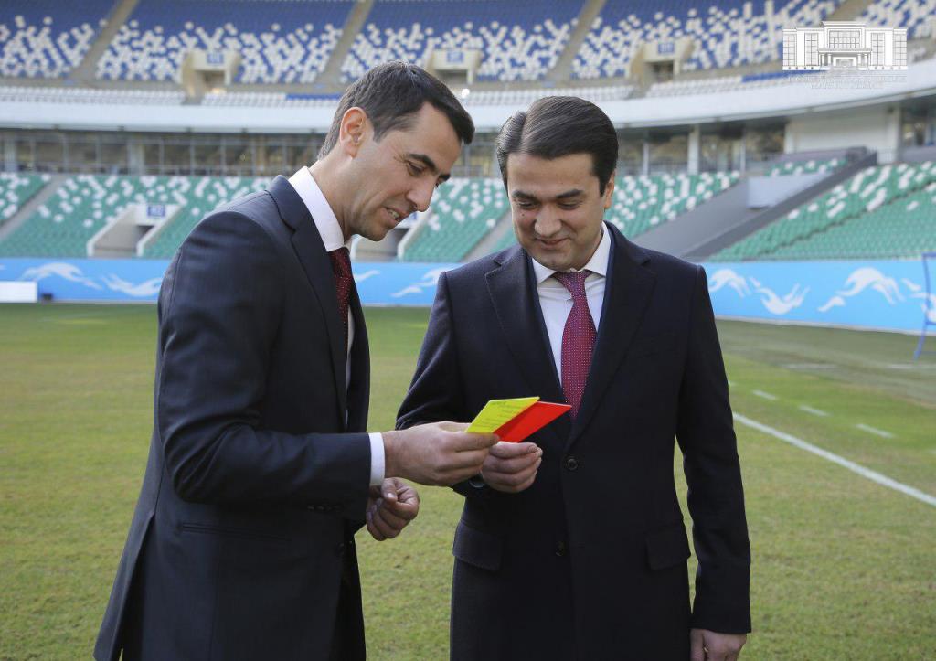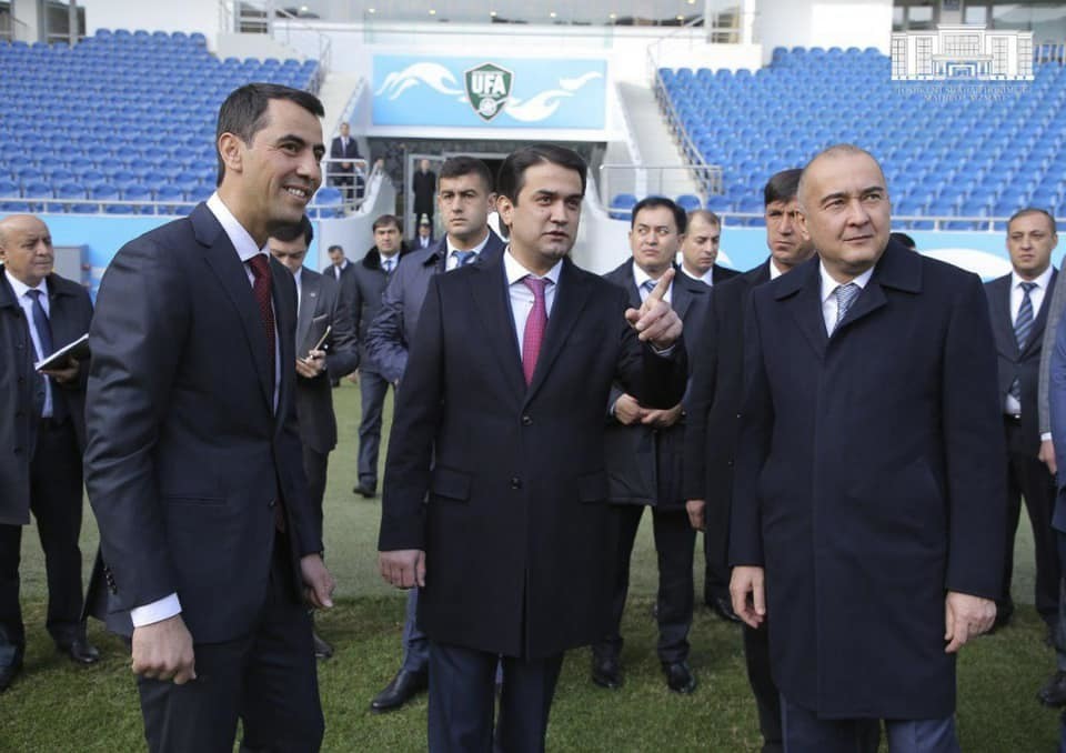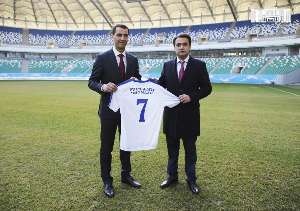 Во время посещения стадиона РустамиЭмомали провел рабочую встречу с первым вице-президентом Ассоциации футбола Узбекистана, известным в прошлом рефери Равшаном Ирматовым.