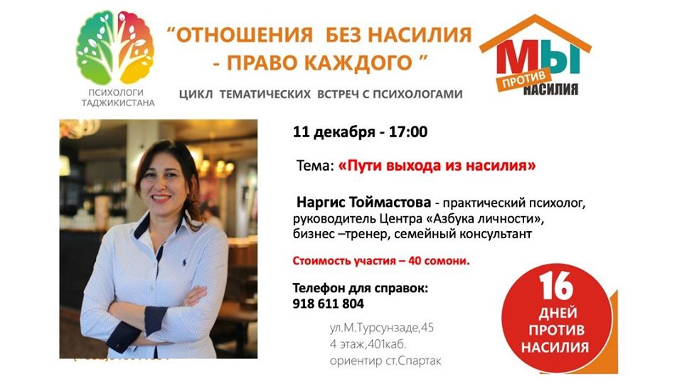 Если у вас низкая самооценка, страх огласки, мучает неграмотность, отсутствие информации, незащищенность, одиночество, состояние отчаяния и как результат, нежелание жить, то у женщин, подвергающихся домашнему насилию есть шанс получить помощь и разорвать этот замкнутый круг. «Психологи Таджикистана» и «Азбука личности» ждут вас 11 декабря в 17.00 по ул. М. Турсунзаде, 45, 4 этаж, 401 кабинет. Стоимость участия: 40 сомони, записаться можно по телефону: 918 611 804.