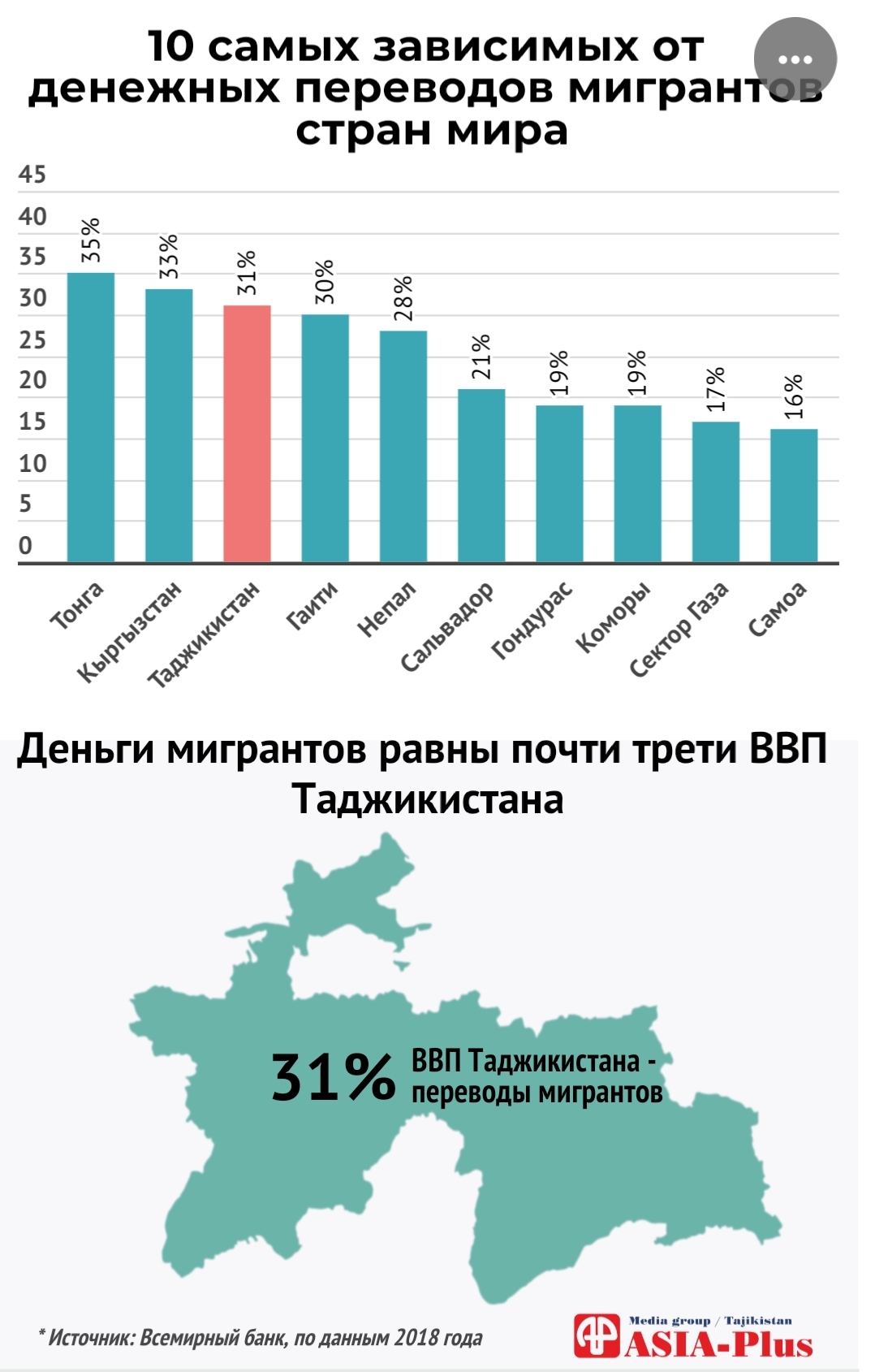 На первом месте по соотношению денежных переводов к ВВП в 2018 году находится Республика Тонга (35,2%), на втором — Кыргызстан (33,6%), а на третьем месте – Таджикистан (31%), говорится в обзоре.