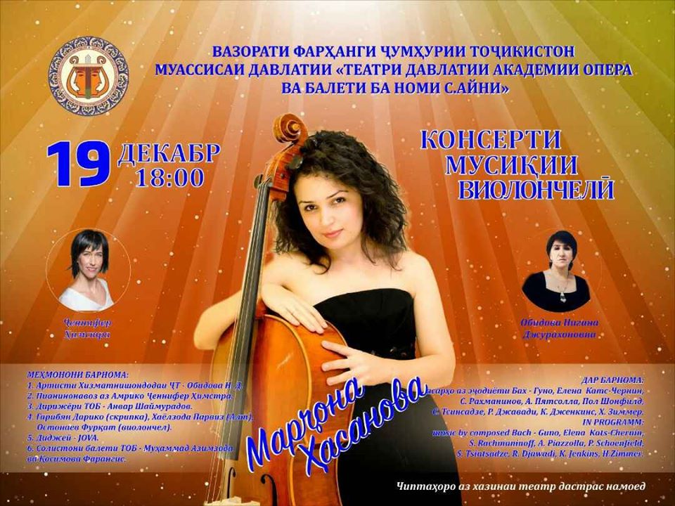 В четверг, 19 декабря, успей побывать на единственном концерте виолончели в Душанбе. Вечер классической музыки Марджоны Хасановой пройдет в 18:00 в Таджикском государственном театре оперы и балета имени Айни.