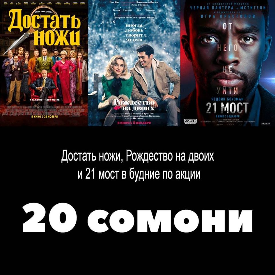 И кстати, акция от кинотеатра "Кайхон": 20 СОМОНИ ЗА БИЛЕТ на три фильма: "21 мост", "Рождество на двоих", "Достать ножи" в будни на следующей неделе. Расписание на сайте www.kayhon.tj Бронируйте по телефону 915886666.