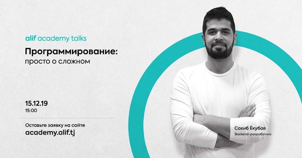Проведи с пользой это воскресенье! С 15:00 до 17:00 состоится Alif Academy Talks — это IT-площадка, где встречаются программисты Таджикистана, делятся своим опытом и знанием. Вас приглашают на встречу с разработчиком «Алифа» — Сохибом Ёкубовым. Спикер разберёт тему: «Программирование: просто о сложном».