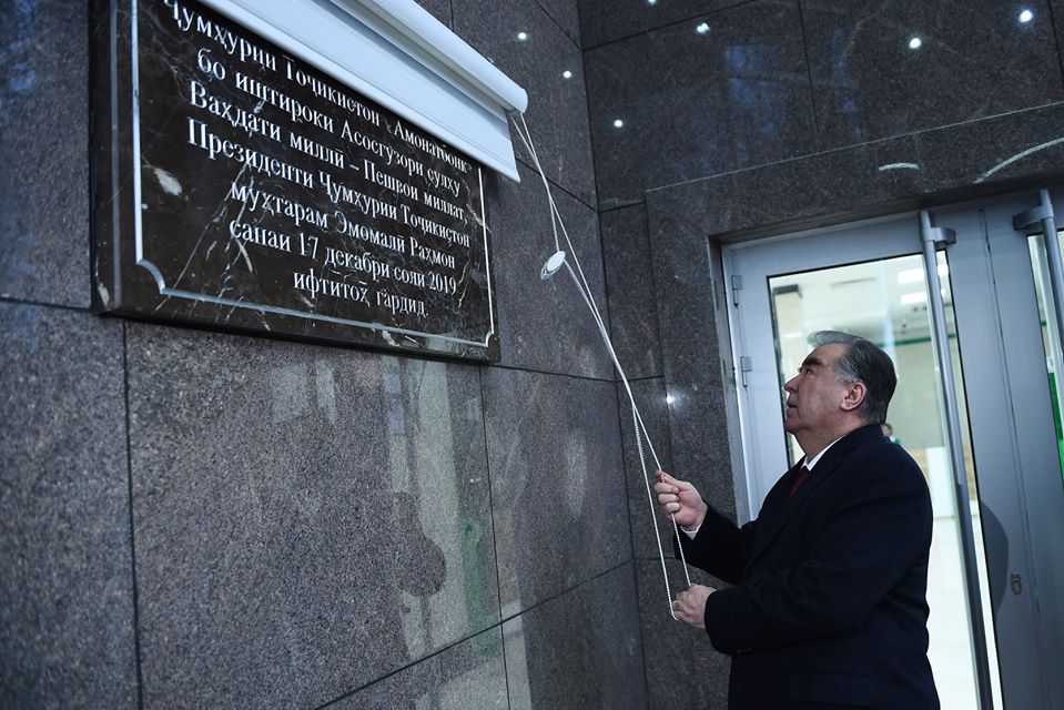 Президент Таджикистана Эмомали Рахмон сегодня, 17 декабря, сдал в эксплуатацию новое здание правления Государственного сберегательного банка республики «Амонатбанк», который возведен на столичном проспекте Рудаки.
