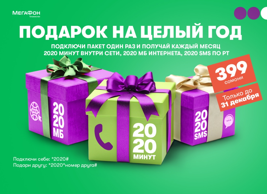 К Новому году абоненты компании «МегаФон Таджикистан» могут подключить специальный пакет, включающий ежемесячно 2020 Мб интернет-трафика, 2020 минут звонков внутри сети и столько же SMS по Республике Таджикистан. Цена пакета – 399 сомони, срок действия – 12 месяцев. Подключить его можно по 31 декабря 2019 года как себе, так и на номер близкого человека, сделав ему новогодний подарок.