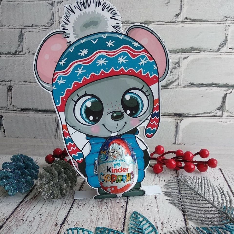Один из вариантов — пузатые мышата с киндером в животике. Размер подставки для киндера 18*19 сантиметров. Цена пустой коробки 15 сомони. При заказе от 5-10 штук, действуют скидки.