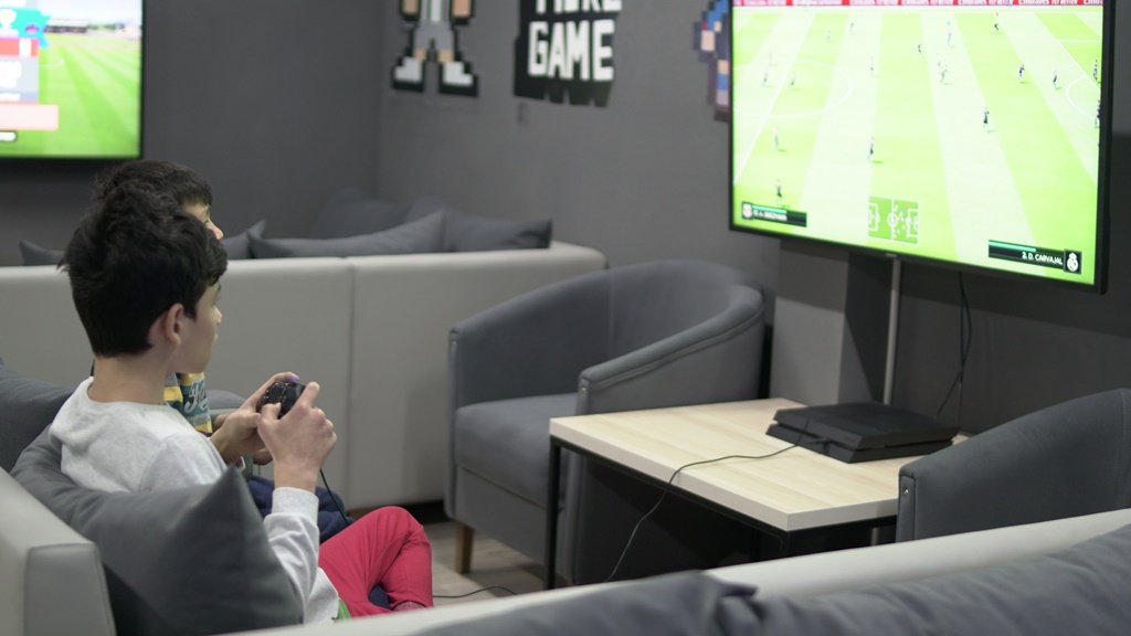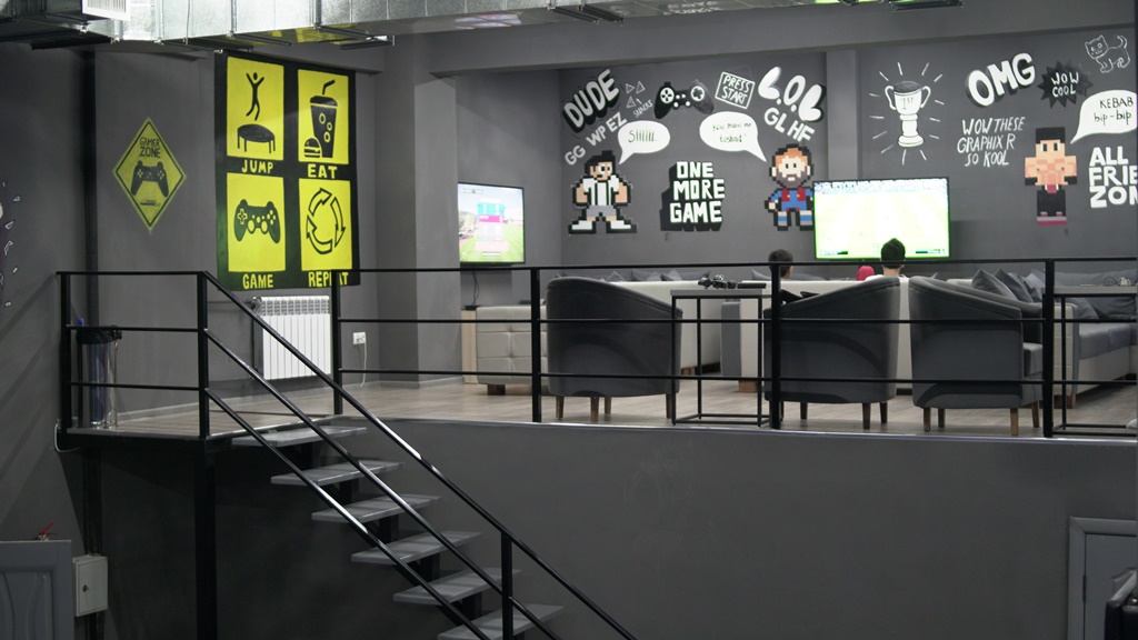 Также есть зоны Play station и Table games, предназначенные в основном для небольших перерывов после длительных тренировок на батуте. Игровая зона Play station располагается на втором этаже центра — это комфортабельный уголок, где можно не только поиграть в любимую приставку, но и просто посидеть и попить кофе и насладиться видом на всю батутную арену.