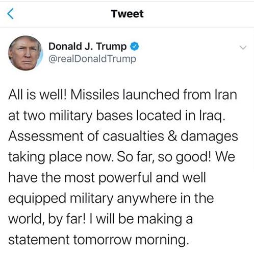 «Все в порядке! Ракеты были запущены из Ирана по двум военным базам, расположенным в Ираке. В настоящее время проходит оценка потерь и ущерба», — написал Трамп в твиттере.
