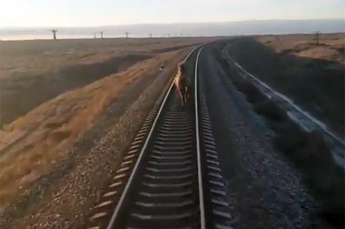 Ранее в Сети появилось видео с верблюдом, мешающим движению поезда, снятое из кабины машиниста. На кадрах видно, как животное бежит перед составом, не обращая внимания на звуковые сигналы.