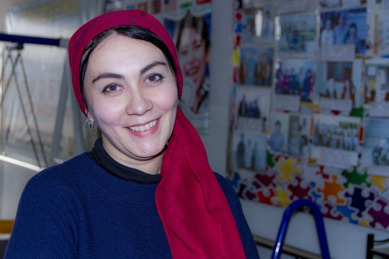 Пока мы разговариваем, Лола не сразу замечает женщину, которая очевидно ждёт, когда мы закончим. Женщину зовут Саодат, она мама особенного ребенка и хочет сделать подарок для младшей дочери Лолы. Подарок – две тряпичные куклы, сделанные своими руками. Все родители здесь что-то создают пока ждут своих детей, это тоже своего рода терапия: отвлекает и помогает прийти в себя, чтобы дать своим детям правильный #Раннийстарт.