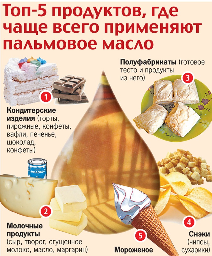 Пальмовое масло сегодня содержится в составе почти всех пищевых продуктов. Крупные кондитерские предприятия мира, шоколадные фабрики, молочные комбинаты, а также другие производители пищевых продуктов просто не обходятся без пальмового масла. Оно, во-первых, доступное и дешевое, во-вторых, не растворяется при температуре +30 градусов, благодаря чему продукт надолго сохраняет свои качества.