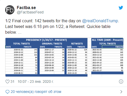 Как сообщает сервис Factba.se, отслеживающий активность американского лидера в Twitter, за 22 января Трамп, находившийся на Всемирном экономическом форуме в Давосе, успел опубликовать 142 твита. Впрочем, большинство из них были ретвитами — 124.