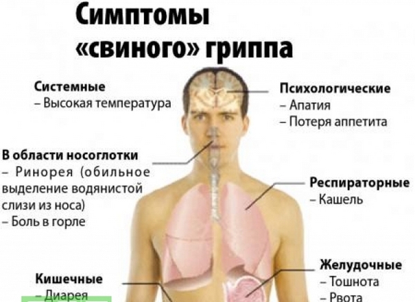Симптоматика у H1N1 и ещё других  разновидностей "животных" гриппов очень похожа. Начинается всё как лёгкая вирусная инфекция верхних дыхательных путей, которая быстро прогрессирует до тяжёлой пневмонии, сепсиса. В ряде случаев начинается внутреннее кровотечение и отказ внутренних органов, после чего — смерть.