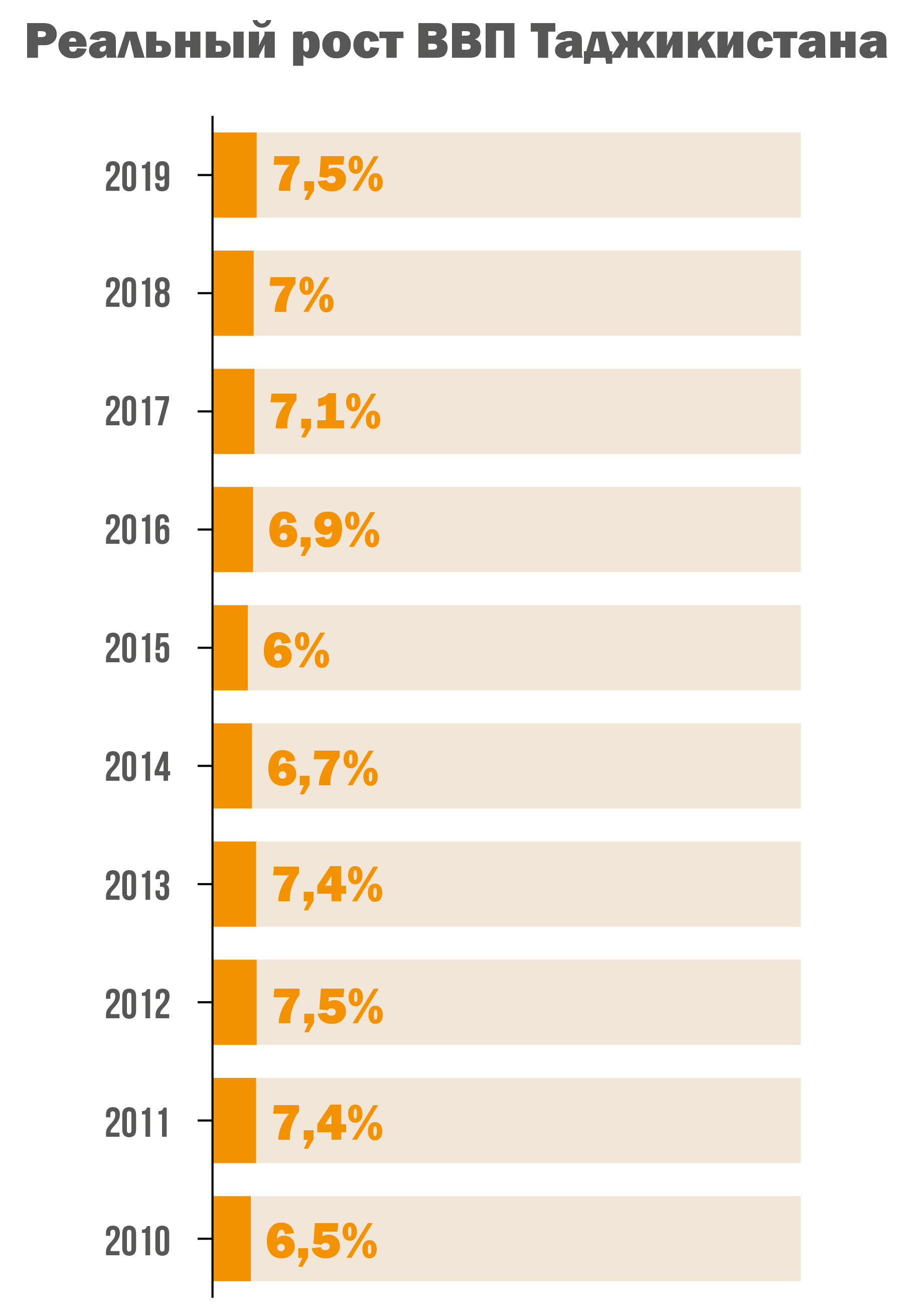 «Этот показатель был обеспечен за счет роста реального объема производства промышленной продукции на 13,4%, сельскохозяйственной продукции на 7,1%, торгового оборота на 8% и платных услуг на 1,6%», — сказал президент страны Эмомали Рахмон во время своего обращения к парламенту в конце прошлого года.