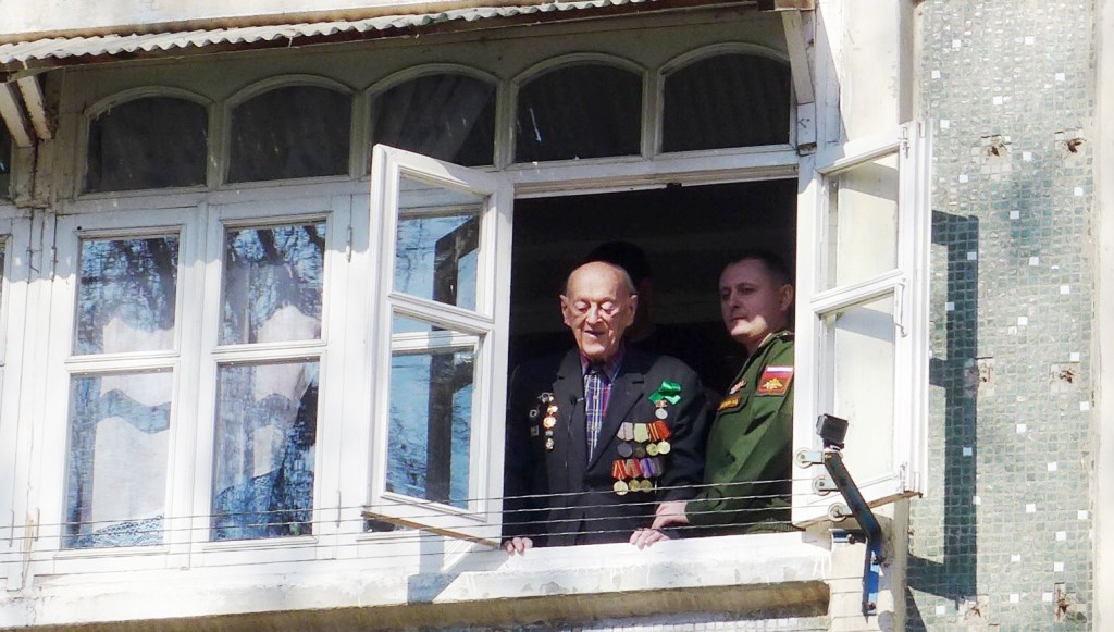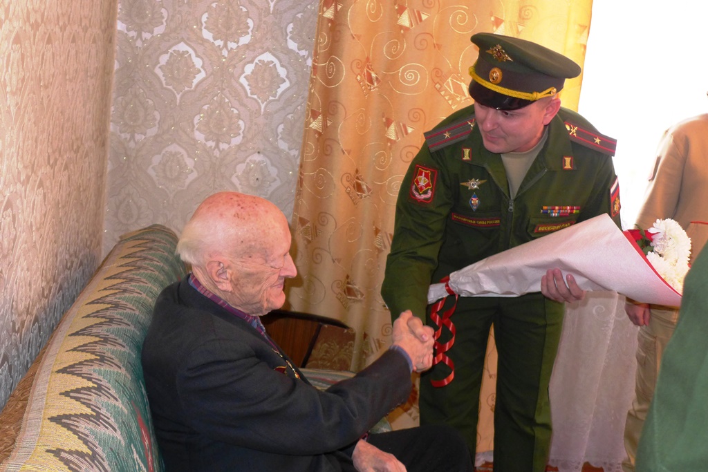 Представители 201 РВБ вручили фронтовику цветы и подарки, а под его окнами музыканты оркестра исполнили три композиции военных лет — «Прощание Славянки», «День Победы» и «Триумф победителей».