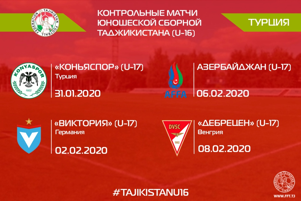Юные таджикские футболисты (U-16) в контрольных матчах на учебно-тренировочном сборе в Турции проведут матчи с командами Азербайджана, Венгрии, Германии и Турции.