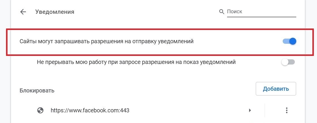 После этого нужно зайти в «Настройки», пролистать вниз и нажать кнопку «Дополнительные». Дальше в разделе «Конфиденциальность и безопасность» открыть «Настройки сайта» и «Уведомления» — в этом меню появится переключатель, который запрещает сайтам запрашивать разрешение на отправку уведомлений.