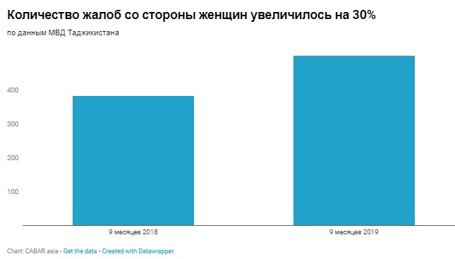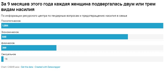По информации ресурсного центра по гендерным делам и предотвращению домашнего насилия Таджикистана, за 9 месяцев 2019 года каждая женщина подвергалась двум или трем видам насилия. Телесному (физическому) насилию – 369, экономическому насилию – 848, психическому насилию – 1084, сексуальному насилию – 16.