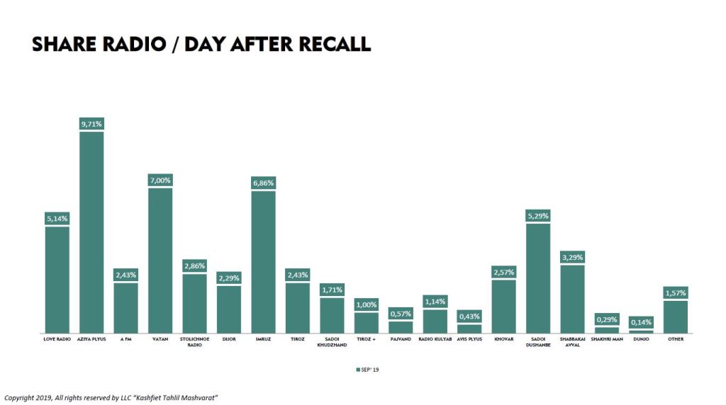 Согласно мониторингу, который проводило ООО «Кашфиёт. Тахлил. Машварат» в третьем квартале 2019 года, радио «Азия-Плюс» занимает первое место среди радиостанций Таджикистана. Также в тройку лучших вошли радио «Ватан» и «Имруз».