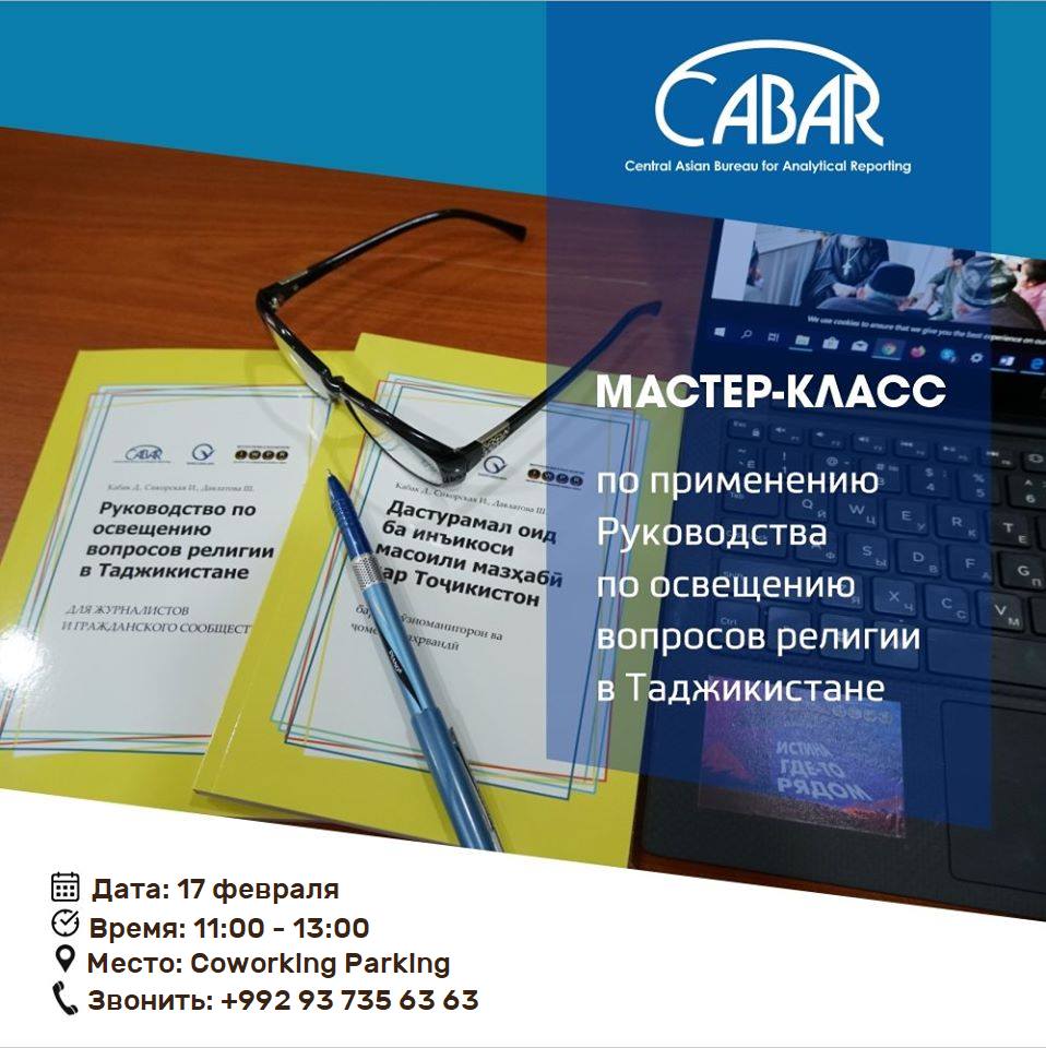 В понедельник, 17 февраля, IWPR Tajikistan приглашает журналистов и представителей гражданского общества на мастер-класс по применению Руководства по освещению вопросов религии в Таджикистане, которое подготовлено IWPR и CABAR.asia. Он состоится в кафе Parking с 11:00 до 13:00. Вы узнаете о международных стандартах освещения вопросов религии, о тонкостях местного законодательства при освещении конфликтно-чувствительных тем и об инструментах освещения вопросов религии с учетом последних тенденций в странах ЦА.