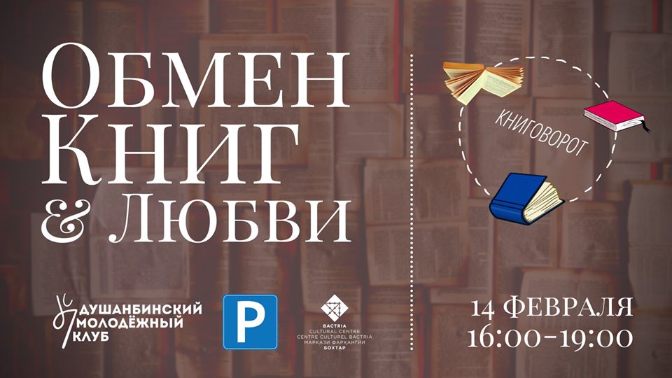 Сегодня, помимо Дня влюбленных, в мире проходит необычная акция – Международный день дарения книг. В Душанбе акция пройдёт в кафе Parking с 16:00 до 19:00. Вы сможете прийти и обменяться своими книгами и выиграть интересные призы, а также получить мастер-класс по Бачате и поприсутствовать на Ярмарке любви. А еще вас ждут музыкальные выступления финалистов проекта «Музыкальной Премии Боба». Вход свободный. Инфо по телефону: 992777106200.