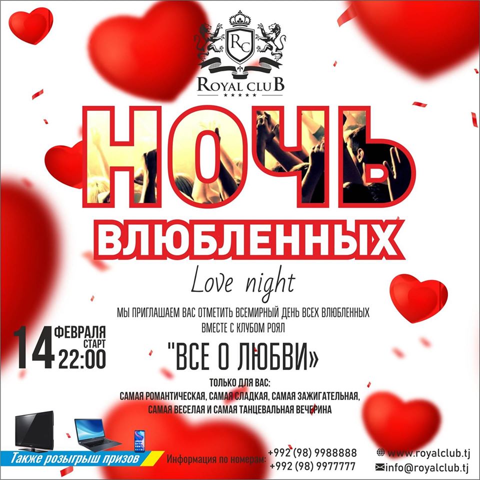 Ну, что, начинаем веселиться? Сегодня в Royal Сlub пройдет Love night. На этой вечеринке ждут всех тех, у кого есть пара, а для тех, кто пока в поиске второй половинки — бегом искать себе пару и просто хорошую компанию. Что вас ждет? Только хорошая музыка, только оригинальные коктейли, только близкие по духу люди и, конечно же, шоу программа и конкурсы. Music: DJ Ruone. Начало в 22:00. Контакты для брони: +992989977777,+992989988888.