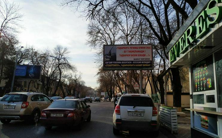 На билбордах воспроизведена цитата Шавката Мирзиёева из речи, которую он произнес в 2018 году: «Предпринимателя трогать нельзя — это запрещено! Предприниматель нас кормит».