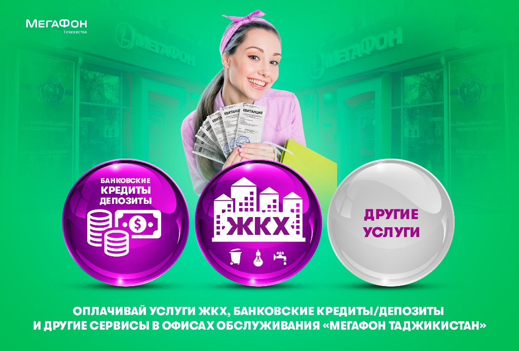 МегаФон Таджикистан расширяет перечень услуг, доступных посетителям центров обслуживания абонентов. В частности, здесь можно будет заплатить по квитанциям за воду и электроэнергию, внести средства для погашения кредита, оплатить домашний интернет и телефонию, депозитный счет, пополнить баланс абонентов других операторов связи и т.д. Оплата принимается без комиссии в любом офисе МегаФона.