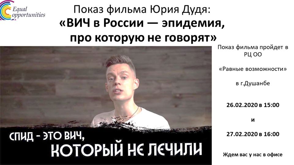 В среду, 26 февраля в 15:00, и в четверг, 27 февраля, в 16:00 в ресурсном центре «Равные возможности» в Душанбе состоится показ фильма Юрия Дудя: «ВИЧ в России — эпидемия, про которую не говорят». Вход свободный.