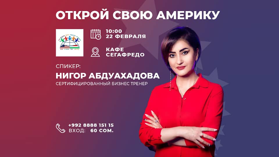 U.S.Alumni Network of Tajilistan – Usant приглашают Вас 22 февраля в 10:00 на мастер-класс "Открой свою Америку" от выпускников американских программ в столичное кафе "Сегафредо". Мечта или реальность?! – об этом вы узнаете от выпускников американских программ, которые уже посетили США и сегодня готовы поделиться своим опытом. на этот раз спикером будет Нигор Абдуахадова, учредитель и руководитель программы «T-MBA». Стоимость участия: 60 сом.