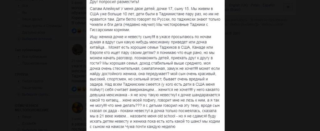 Как и в случае с невестами, женихов нынче таджикистанцы тоже ищут в социальных сетях. Таких постов чуть меньше и написаны они в более шуточной форме.