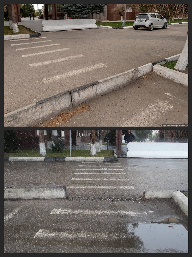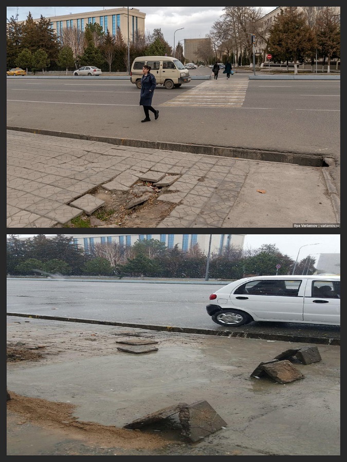 «Самая большая проблема в Самарканде в том, что это очень опасный город! Стоит на секунду расслабиться — и вы сломаете себе ноги, а возможно, умрете!» — написал урбанист, сопровождая текст фотографиями высоких бордюром перед пешеходными переходами, провалившегося асфальта и открытых арыков.