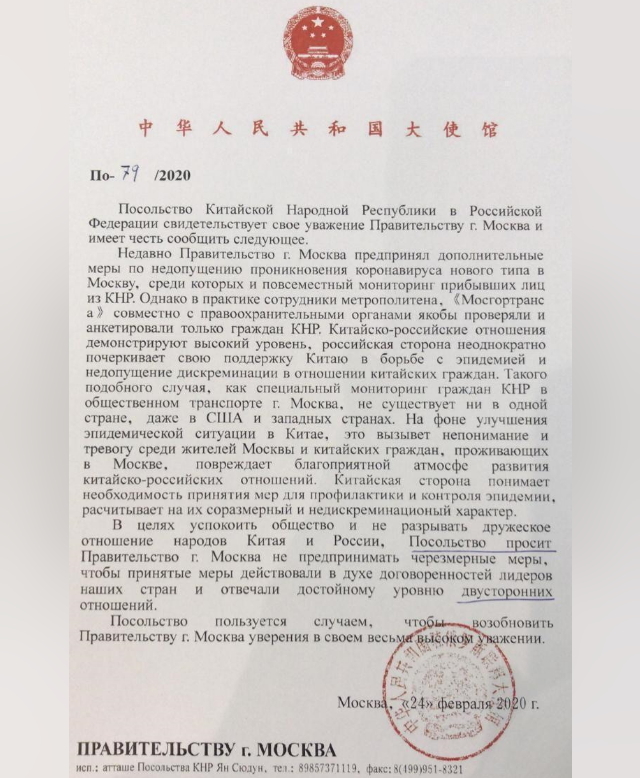 Посольство Китая в РФ попросило московские власти выбрать «соразмерные и недискриминационные» меры профилактики и контроля эпидемии коронвируса вместо проверок китайских граждан в общественном транспорте. Об этом говорится в обращении дипломатов, копию которого опубликовала «Новая газета».